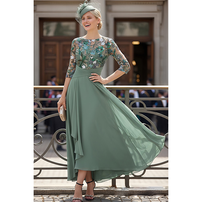 A-Line Dress Asymmetrical Ankle Length Beaded Eembroidered Party Dress Cocktail Dress Mother of the Bride Dress 3/4 Length Sleeve Illusion Neck Elegant Vintage Wedding Guest Church Chiffon Lace with