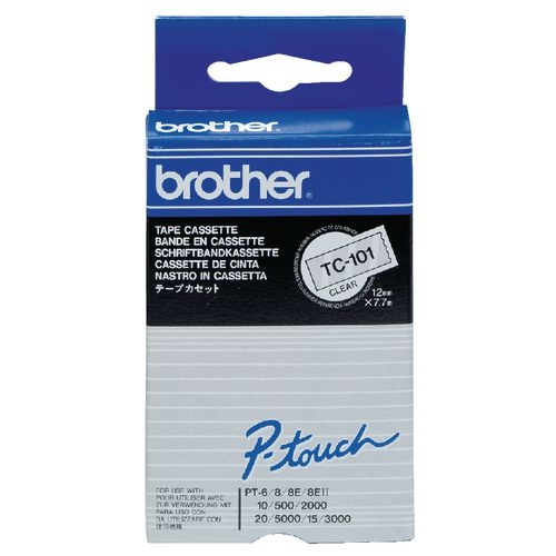 Brother TC-101 Authentic Schriftband Selbstklebend Schwarzer Druck auf Transparent 12 mm x 7.7m
