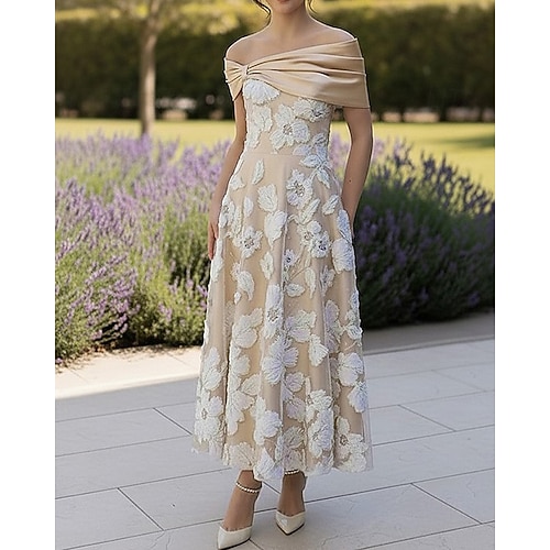 Linea ad A Lunghezza Tè Abiti da Cocktail Abito da Sera Abiti da festa Elegante Scintillante Stile Celebrità Senza Maniche Senza Spalle Festa in giardino Matrimonio Pizzo Raso Elasticizzato con