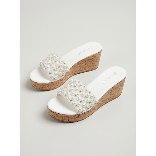 Elegante schwarze Keilsandalen mit Perlenbesatz für Damen – mit Kunstperlen, ideal für Kreuzfahrten und Abendpartys an Deck. Luxus-Resortbekleidung