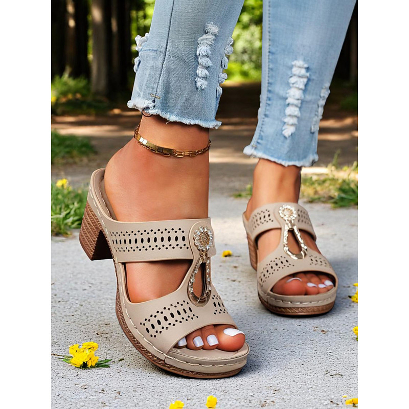 Women's Chunky Heel Mule Sandals – Hollow-Out Rhinestone Design, Retro Buckle Decor, Comfortable Sole, for Outdoor Walks, Garden and Casual Summer Outfits