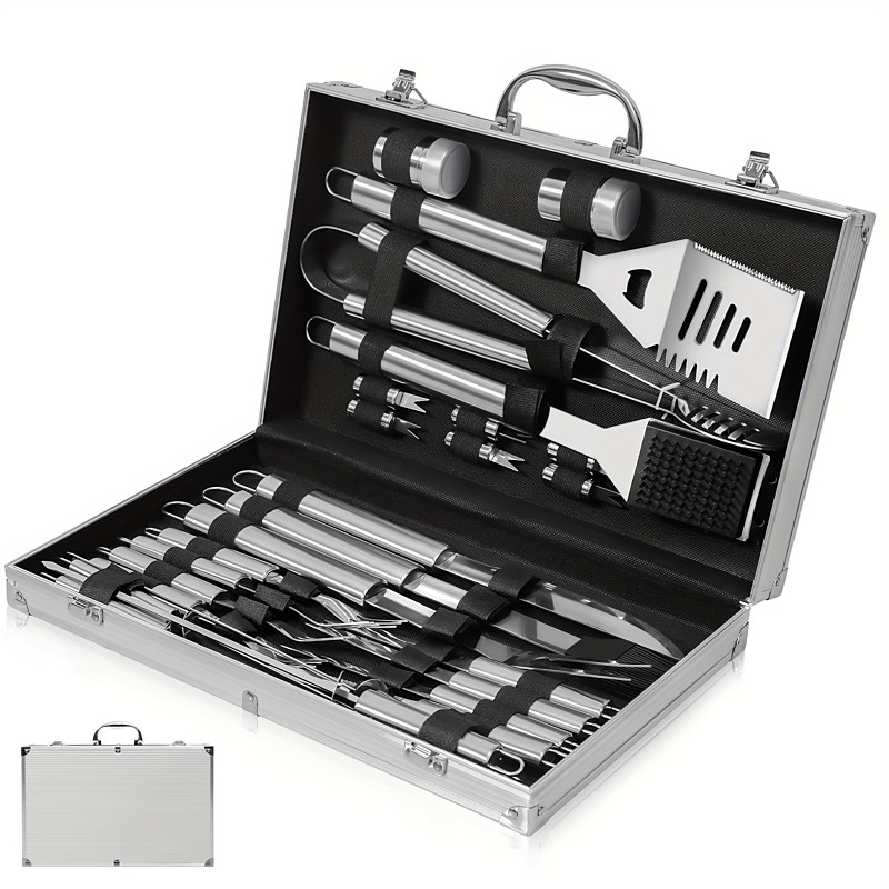 Heavy Duty BBQ Grill Gear Set - 5/18/26 Stainless Steel Accessories, Aluminum Storage Case, Complete Outdoor Kit for Men Women