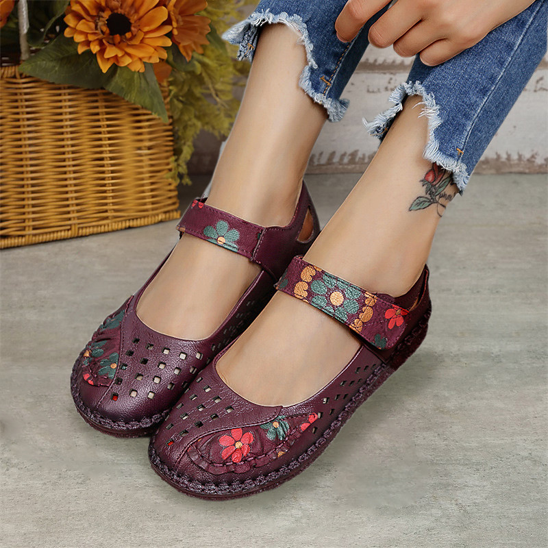Women's Red Leather Barefoot Mary Jane Flats – Embroidered Floral Casual Comfort Shoes with Hook Loop Straps