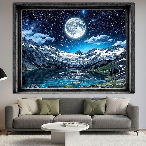 notte stellata luna piena montagna lago 3d finestra vista arazzo da parete picco innevato foresta di pini paesaggio arredamento per la casa soggiorno camera da letto arazzo decorazione sfondo scenico