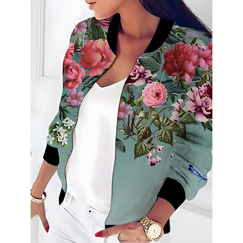 Women's Casual Jacket Warm Quick Dry Zipper Pocket Elegant Fashion Daily Simple Floral Vacation Casual Daily Holiday Regular Baseball Collar Regular Fit Long Sleeve Outerwear Black And White Blue
