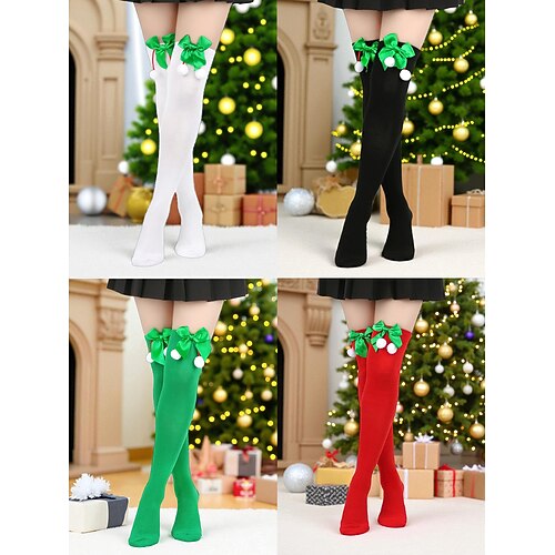Damen Weihnachtsstrümpfe Set, 4 Paar gestreift einfarbige rote Weihnachtsstrümpfe mit Schleifen und Bommeln, festliche Overknee-Socken für Winterpartys Geschenke
