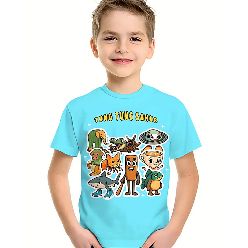 Boys' Blue T-Shirt with Cartoon Character Print - Tung Tung Tung Sahur Design T shirt Tee Short Sleeve Summer Spring Fashion Basic Kids 4-12 Years Crew Neck Outdoor Casual Daily Regular Fit
