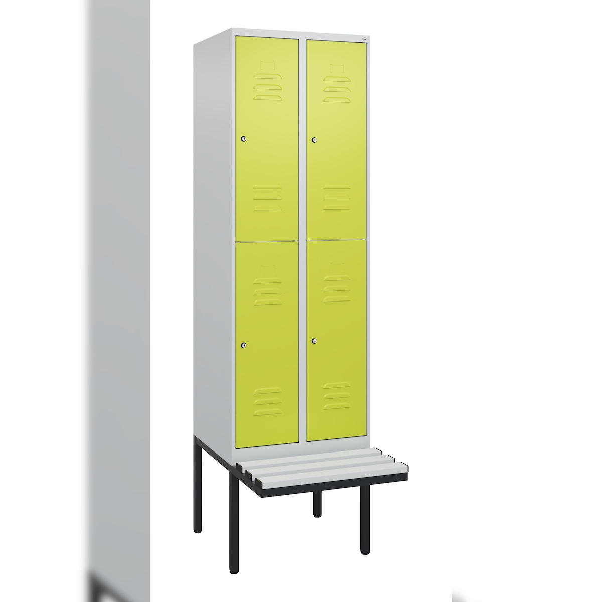 C+P Spind Classic PLUS, Kunststoff schwebende Sitzbank, 4 Abteile, HxBxT 212x60x82cm, Zylinderschloss, Hellgrau/Clowngrün von PROREGAL