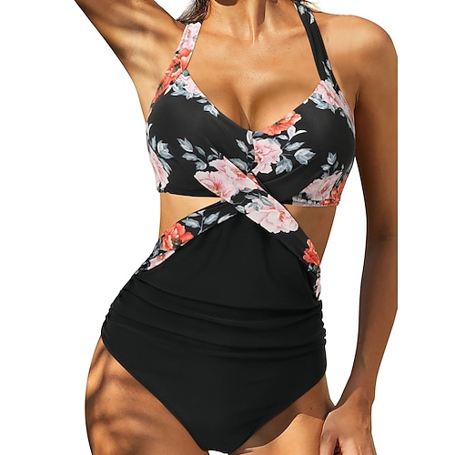 Costume da bagno intero da donna arricciato sexy cutout leopardato monokini alto controllo della pancia alta vita slim senza schiena vacanza mare abbigliamento solido colore collo all'americana senza