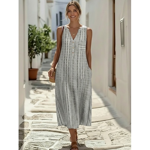 Per donna Abito Midi Vestito Casual Abito a trapezio Elegante Casual Quotidiano Vacanza Vestibilità comoda A righe Manica Corta Girocollo Grigio Azzurro Estate Primavera