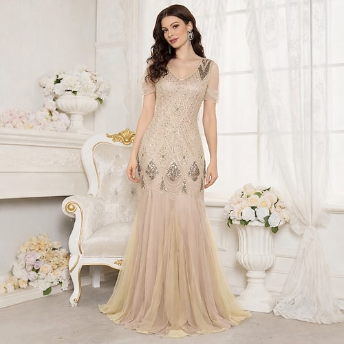 Retrò Vintage Anni Ruggenti Anni 1920 Lunghezza alla caviglia Vestito Abito da sera Maniche corte Il grande Gatsby Invitato al matrimonio Paillettes Scollo a V Costume Per donna Mascherata Matrimonio