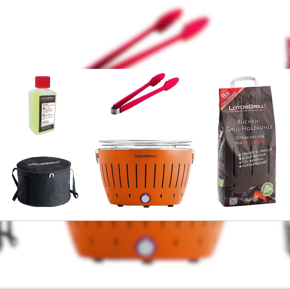 LotusGrill XL Starter-Set 1x XL Grill Feuerrot mit USB-Anschluß, 1x Buchenholzkohle 2,5 kg, 1x Brennpaste 200ml, 1x Zange, 1x Transport-Tragetasche