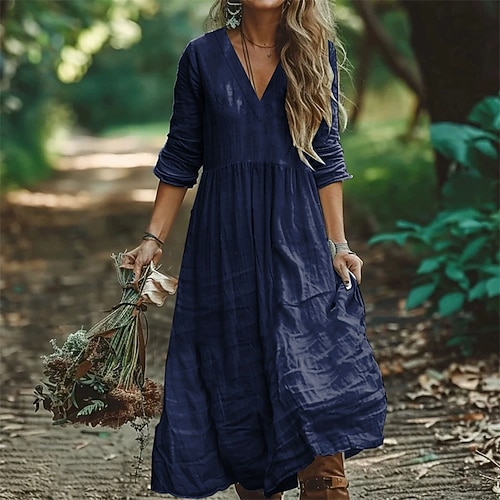 Per donna Abito Midi Abito in cotone e lino Moda Classico Moderno All'aperto Vacanza Ferie Vestibilità regolare Semplice Manica 3/4 Scollo a V Nero Verde militare Arancione Blu scuro Estate