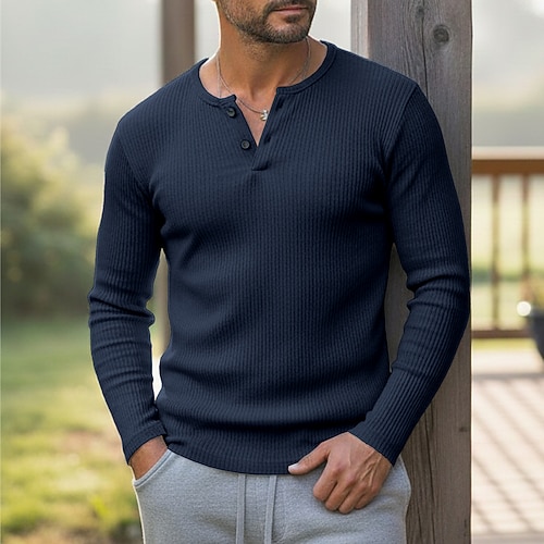 Herren T Shirt Geripptes Strick-T-Shirt T-Shirt Langarmshirt Langarm Henley Frühling Herbst Winter Einfach Grubenstreifen Mode Designer Basic Stricken Urlaub Straße Lässig Blau Weiß Marineblau Top