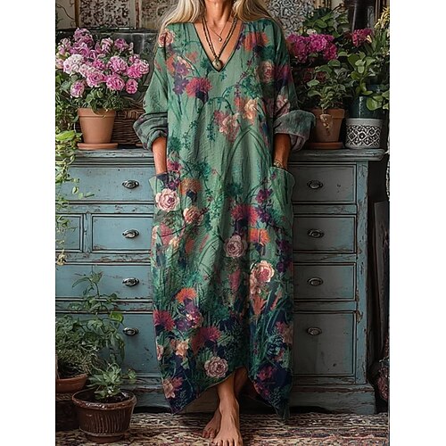 Damen Midikleid A Linie Kleid Urlaub Lässig Täglich Lässiger Schnitt Blumen Grafik Langarm V Ausschnitt Blau Rote Grün Frühling Herbst