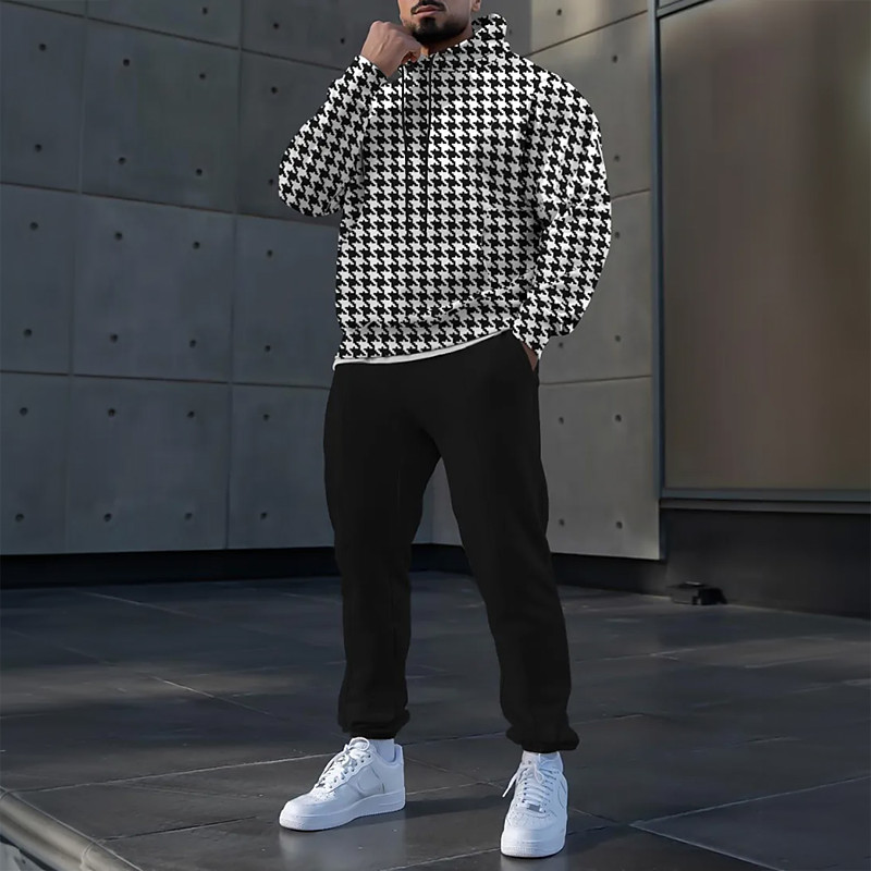 Men's Color Block Houndstooth 2pcs 3D Sweatshirt Sets Tracksuit Hoodie Sweatshirt Long Sleeve Long pants Hooded Casual Daily Athleisure 3D Print Spring Fall Winter Black