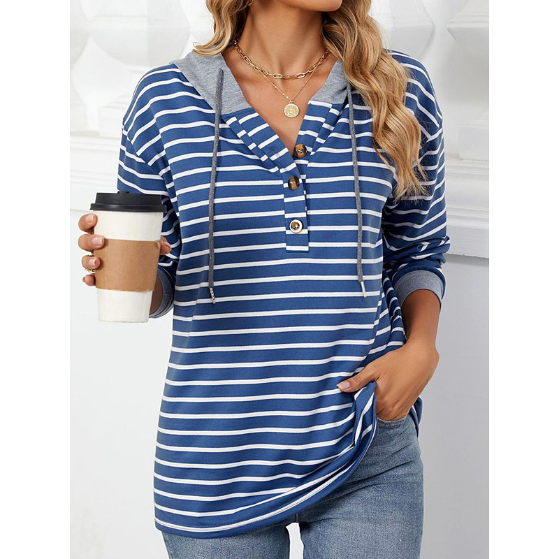 Women's Hoodie Sweatshirt Casual Striped Street Dailywear Hoodie Buttons Print Long Sleeve Navy Blue Green Fall Winter