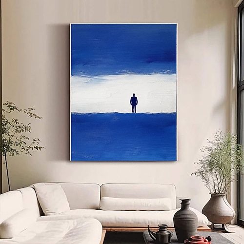 Minimalistische Strandkunst, 100 % handgemaltes blau-weißes Strand-Ölgemälde, moderne blaue Landschaft, Wohndekoration, zeitgenössische Wandkunst