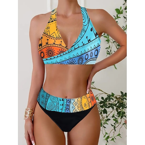 Costume da bagno bikini da donna 2 pezzi alla moda snellente senza schienale abbigliamento da spiaggia per le vacanze geometrico a blocchi di colore scollo a V senza maniche