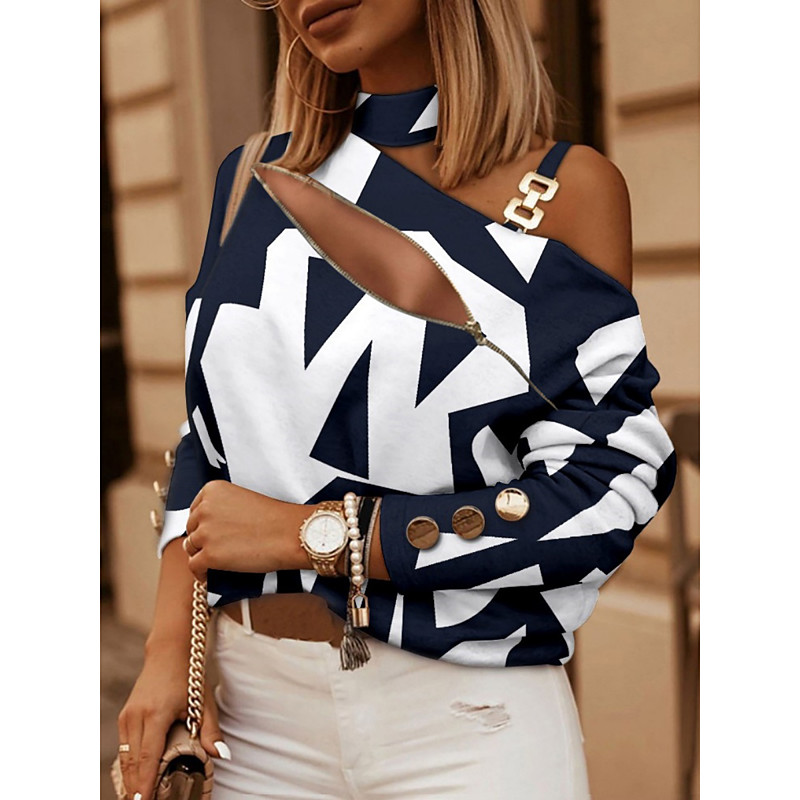 Women's Shirt Blouse Geometric Stylish Casual Long Sleeve Asymmetrical Regular Tops Daily Patchwork Print White Navy Blue Khaki Gray Summer Spring