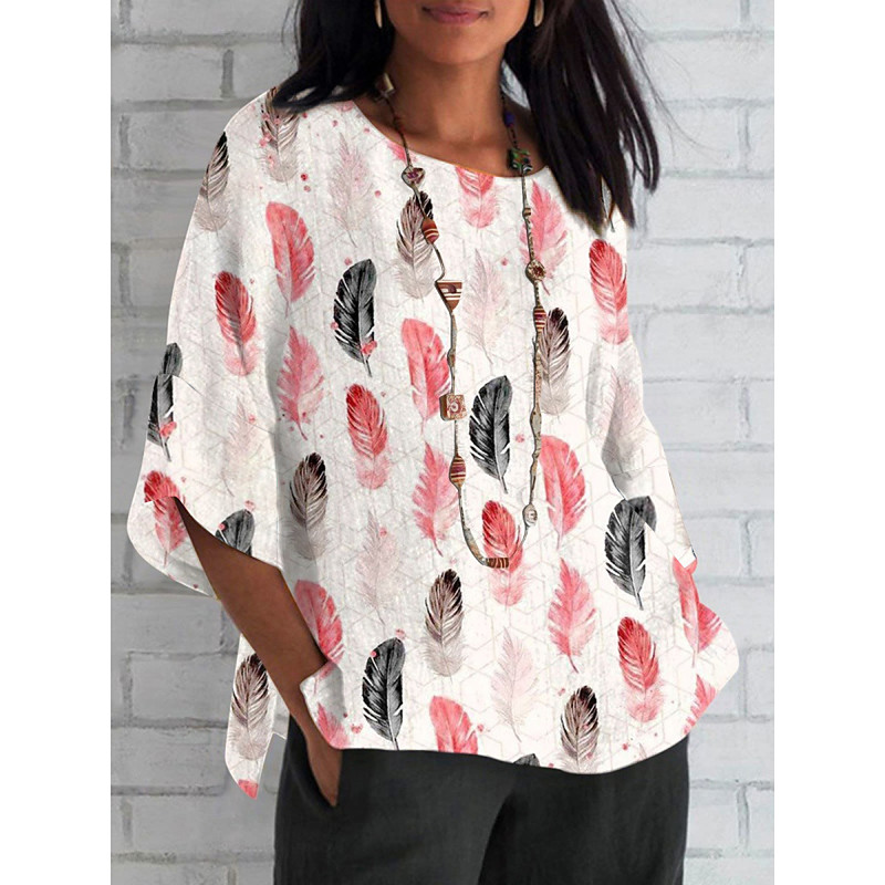 Women's Shirt Feather Daily Casual 3/4 Length Sleeve Crew Neck Regular Tops Daily Holiday Print White Pink Blue Summer Spring Fall