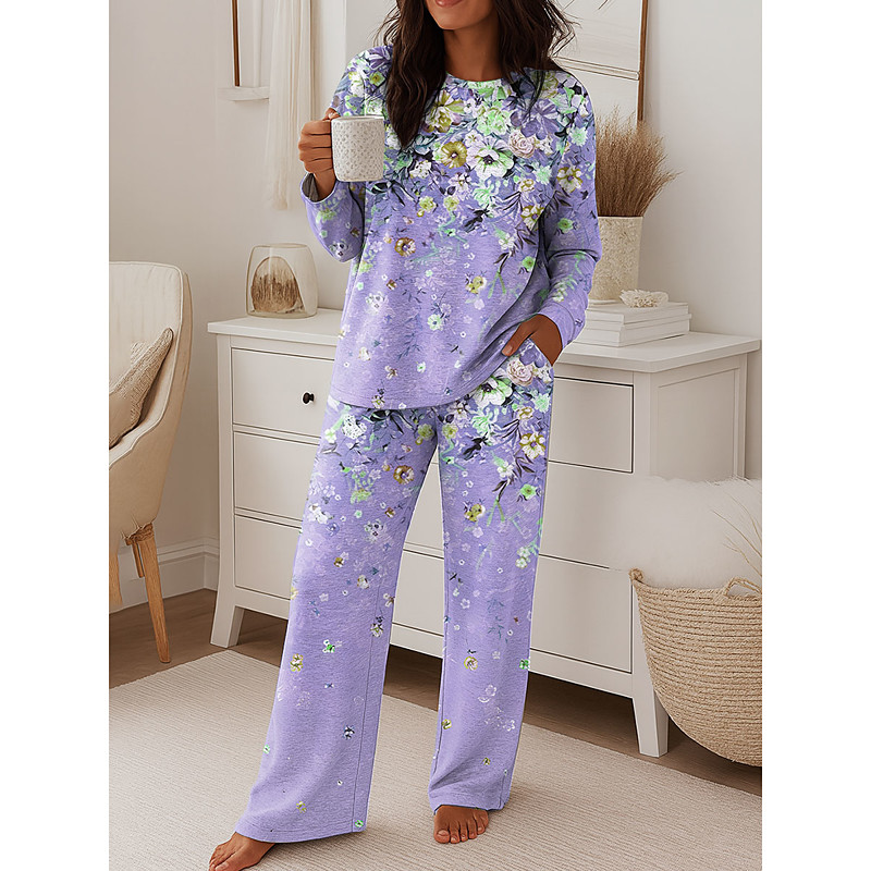 Women's Fashion T Shirt Pants Sets Long Sleeve Round Neck Floral Graphic Print Casual Daily Pink Blue Purple Spring Regular Fit
