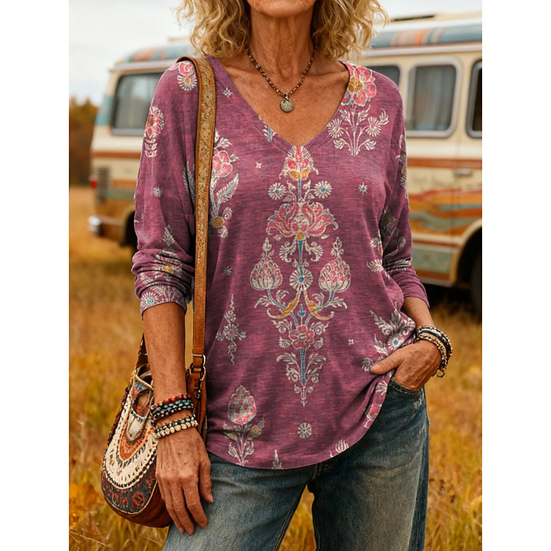 Women's T Shirt Graphic Plants Vintage Stylish Casual Long Sleeve V Neck Regular Tops Daily Print Pink Red Purple Spring Fall