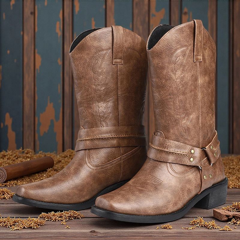 Brown Faux Leather Men's Western Style Boots with Strap Detail – Stylish and Durable Footwear for Western and Casual Events