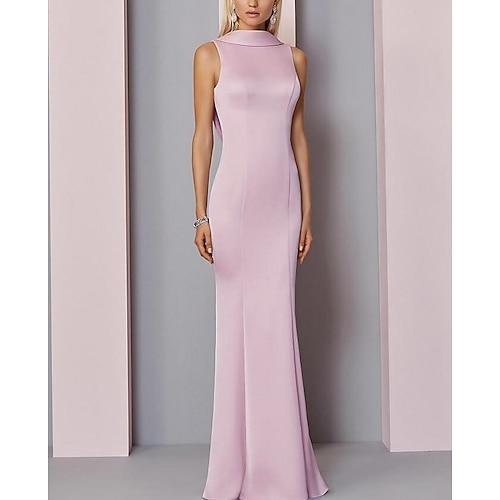 Abito da Sera Sheath per Matrimonio Sulla Spiaggia Elegante Ospite di Matrimonio Fidanzamento Lungo Fino al Pavimento Senza Maniche Collo Alto Satinato Retro a V con Pieghe