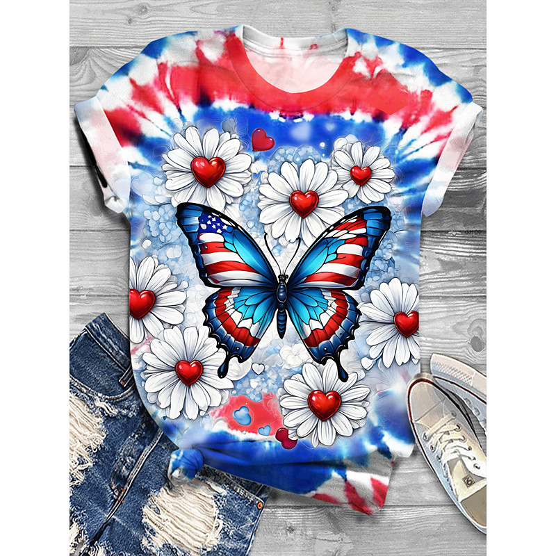 American Independence Day Women's T Shirt Graphic Butterfly American Flag Vintage Stylish Casual Short Sleeve Crew Neck Regular Tops Daily Weekend Print Blue White Red Summer Spring
