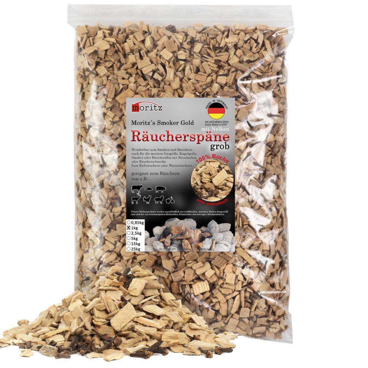 Moritz 1kg Räucherspäne Buche mit Nelke grob 6 -12 mm Räuchern I Kalträuchern von Fisch Fleisch Wurst Käse Gemüse auch für BBQ I Grill - Räuchermehl