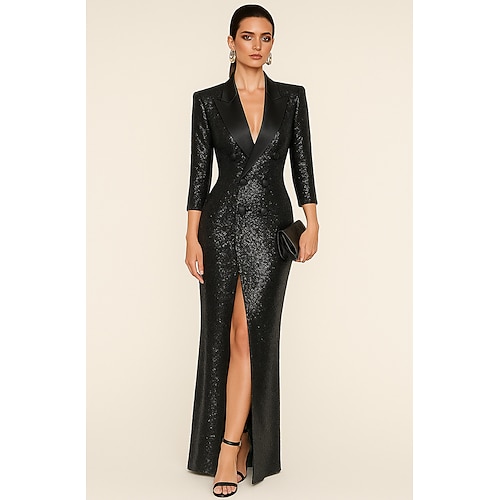 Per donna Abito blazer Abito da smoking Guaina Affari Formale Ospite di nozze Raso Strass Elegante Spacco Alto Manica 3/4 Lunghezza al pavimento Bavero a lancia Doppiopetto