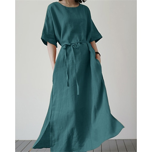 vestito midi da donna in cotone e lino, vestito a trapezio, vestito estivo, casual, da vacanza, quotidiano, vestibilità ampia, tinta unita, mezza manica, girocollo, azzurro, nero, bianco, verde,