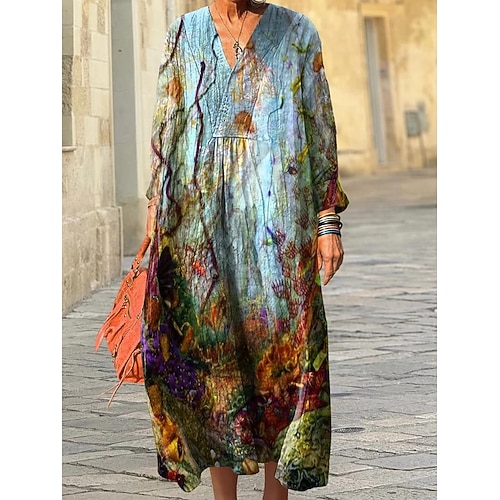 Per donna Abito Midi Vestito Estivo Abito a trapezio Vacanza Casual Boho Feste Ferie Spiaggia Vestibilità comoda Floreale Grafico Manica Lunga Scollo a V Verde salvia Blu turchese Marrone Estate