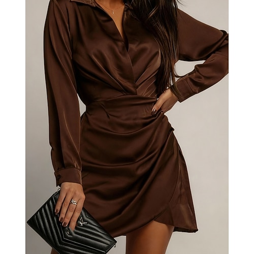 Per donna Mini Abito Abito in Raso Abito Camicia Abito arricciato Moderno Quotidiano Uscire Weekend Vestibilità regolare Semplice Manica Lunga Colletto a Camicia Nero Verde scuro Marrone Rosso rosa