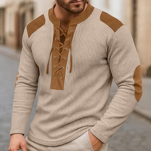 Herren T Shirt Henley Hemd Waffelstrick T-Shirt T-Shirt Langarm Stehkragen Schnürhals Frühling Herbst Farbblock Mode Designer Basic Patchwork Urlaub Straße Ausgehen Schwarz Marineblau Kaki Top