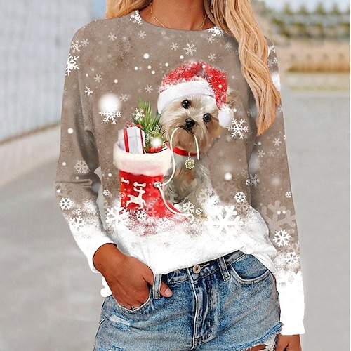 Natale Per donna Maglietta Grafico Cane Natale Vintage Moda Elegante Manica Lunga Girocollo Top Regolari Quotidiano Weekend Stampato Blu Viola Fucsia Verde Cachi Autunno Inverno