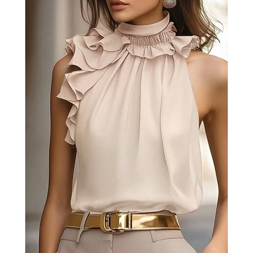 Damen T Shirt Tank Top Einfarbig Elegant Mode Ärmellos Hoher Ausschnitt Normale Oberteile Täglich Ausgehen Wochenende Rüsche Schwarz Rote Braun Khaki Sommer Frühling