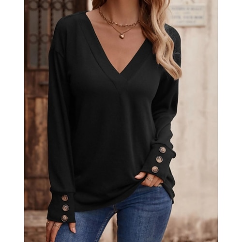 Per donna Maglietta Tinta unica Moda Elegante Classico Manica Lunga Scollo a V Top Regolari Quotidiano Uscire Weekend Bottoni Blu Nero Bianco Rosa Vino Primavera Autunno