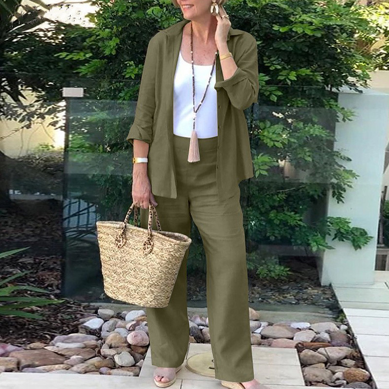 Women's Daily Shirt Cotton Linen Sets Two Piece Sets Long Sleeve Shirt Collar Solid Color Dubbele Rij Knopen Daily Wear Casual Daily Army Green Dark Navy Gray Summer Regular Fit
