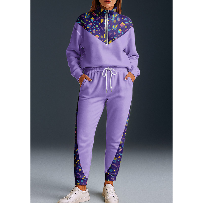 Women's Sweatshirt Tracksuit 2 Piece Tracksuit Baggy Geometric Clothing Suit Fall Purple Vocation Outdoor Travel Lightweight Fashion Long Sleeve Sport Activewear Stretchy Regular Fit