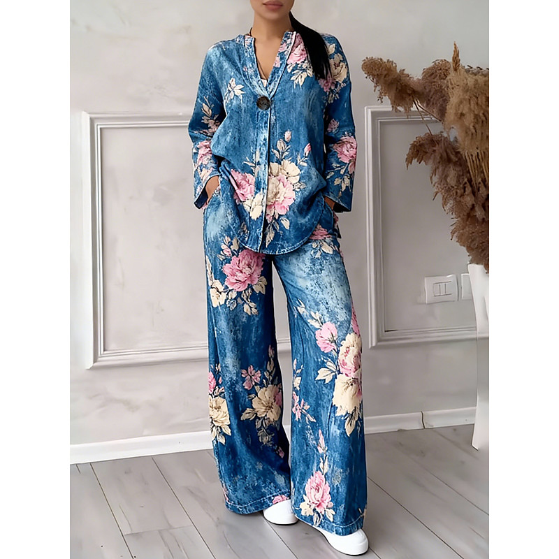 Women's Daily Stylish Two Piece Sets Tracksuit Pants Sets 3/4 Length Sleeve V Neck Floral Graphic Print Casual Daily Blue Spring Fall Loose Fit