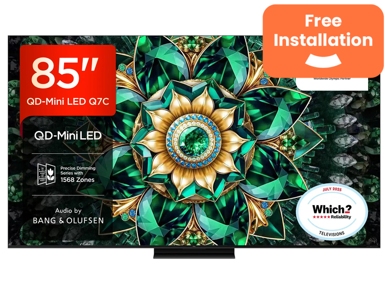 TCL 85Q7C-UK 85” QD-Mini LED TV, 4K UHD, Smart Google TV with 144Hz Motion Clarity Pro, Dolby Atmos, Audio by Bang & Olufsen, Game Master