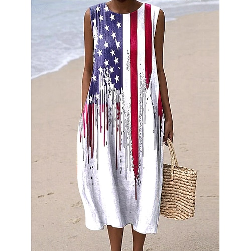 Giorno dell'Indipendenza Americana Per donna Abito Midi Abito a Tubino Vestito Estivo Vacanza Festa Casual Quotidiano Vestibilità regolare Vestibilità comoda Bandiera Senza Maniche Girocollo Blu
