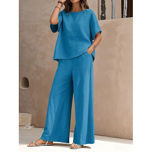 Per donna Set di Pantaloni Finto cotone e lino Manica Corta Girocollo Tinta unica Moda Streetwear Casuale Quotidiano All'aperto Blu Nero Giallo Estate Vestibilità comoda