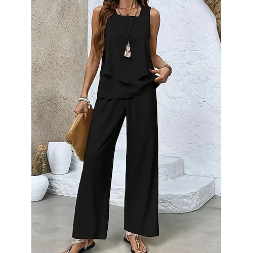 Per donna Set di Pantaloni Senza Maniche Collo quadrato Semplice Arricciato Elegante Moda Streetwear Casuale Quotidiano All'aperto Nero Rosso Beige Estate Vestibilità regolare Vestibilità comoda