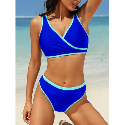 Costume da bagno da donna bikini a 2 pezzi con slip sbarazzino schiena scoperta abbigliamento da spiaggia per le vacanze costumi da bagno senza maniche a collo V di colore solido