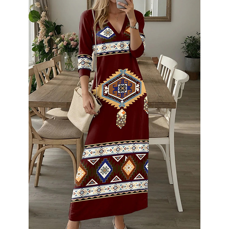 Women's Maxi Dress A Line Dress Casual Daily Loose Fit Floral Long Sleeve V Neck Yellow Wine Red Blue Spring Fall