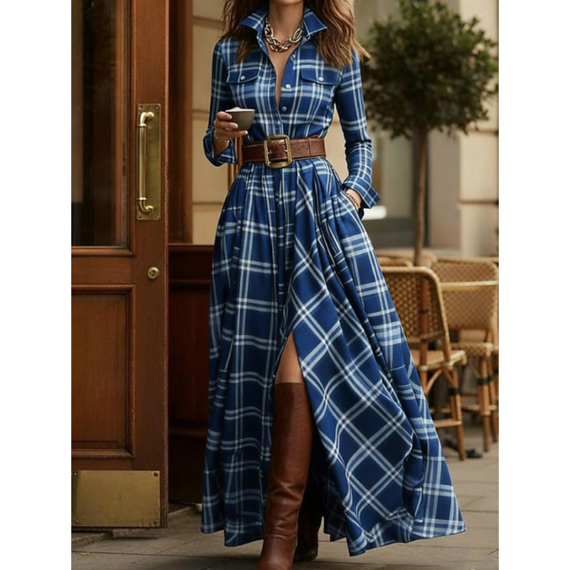 Women's Maxi Dress Shift Dress Vacation Casual Boho Daily Regular Fit Plaid Long Sleeve Shirt Collar Blue Red Green Spring Fall Winter