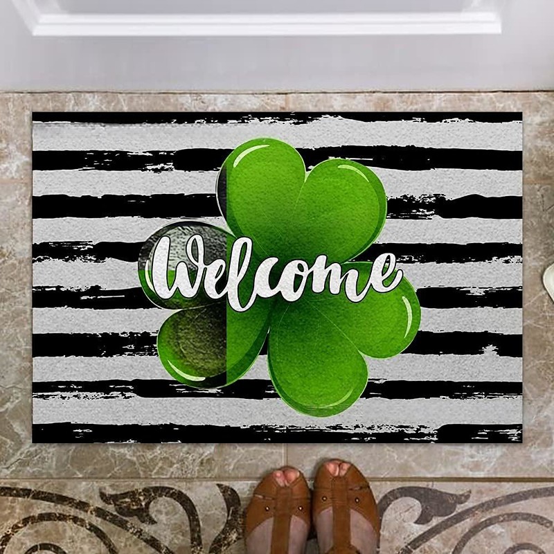 St. Patrick's Day Door Mat, Irish Four-Leaf Clover Design, Entryway Floor Mat, Festive Green Clover Door Rug for St. Patrick's Day Celebration.